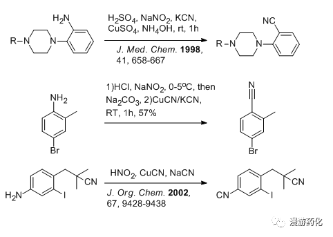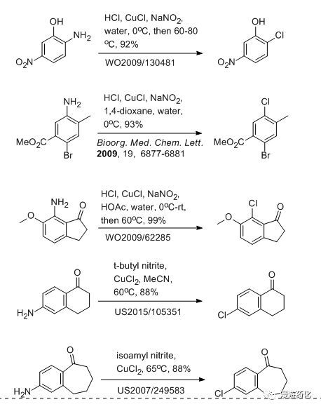 對(duì)于重氮鹽生成鹵代芳烴和腈基化合物的反應(yīng),其機(jī)理還沒(méi)有完全搞清楚,一般我們認(rèn)為是一個(gè)自由基反應(yīng),苯環(huán)上的取代基(如羥基,烷氧基,?;?,羧基,硝基和鹵素等),無(wú)論是吸電子基團(tuán)還是供電子基團(tuán),對(duì)反應(yīng)都沒(méi)有特別的影響,氯代必須用CuCl/HCl 體系,溴代則要用CuBr/HBr 體系,碘代則一般用鹽酸做重氮鹽,不用Cu 鹽催化,直接加KI或NaI 就能得到碘苯。